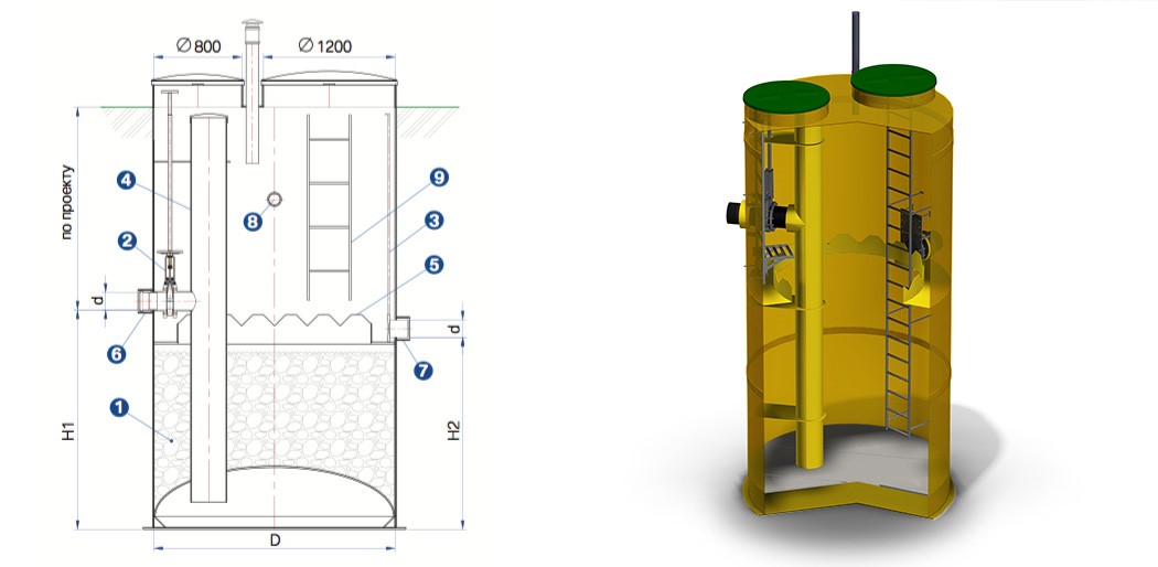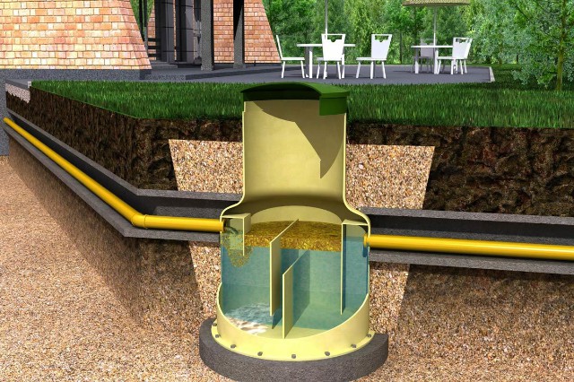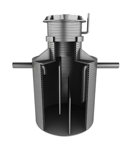 Жироуловитель представляет собой цилиндрическую емкость, в которой оборудованы две камеры: первичный отстойник и накопление жира, вторичный отстойник